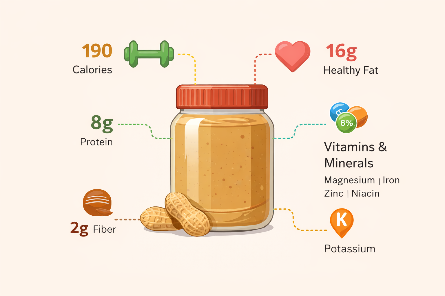 Two tablespoons of natural peanut butter provide a well-rounded combination of macronutrients and micronutrients, including: